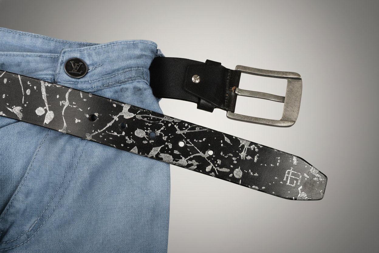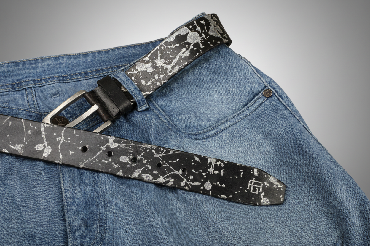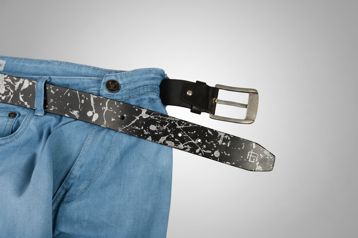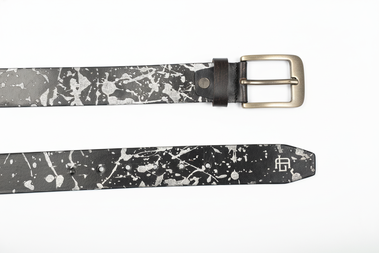 Abstract Series Pearl Metallic Leather Belt — Elevate your style with this full-grain leather belt featuring laser-etched abstract patterns and hand-painted pearl metallic accents. Durable, versatile, and uniquely artistic, it’s the perfect statement accessory for casual or polished looks.