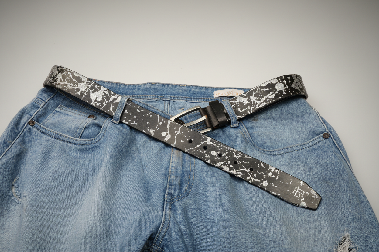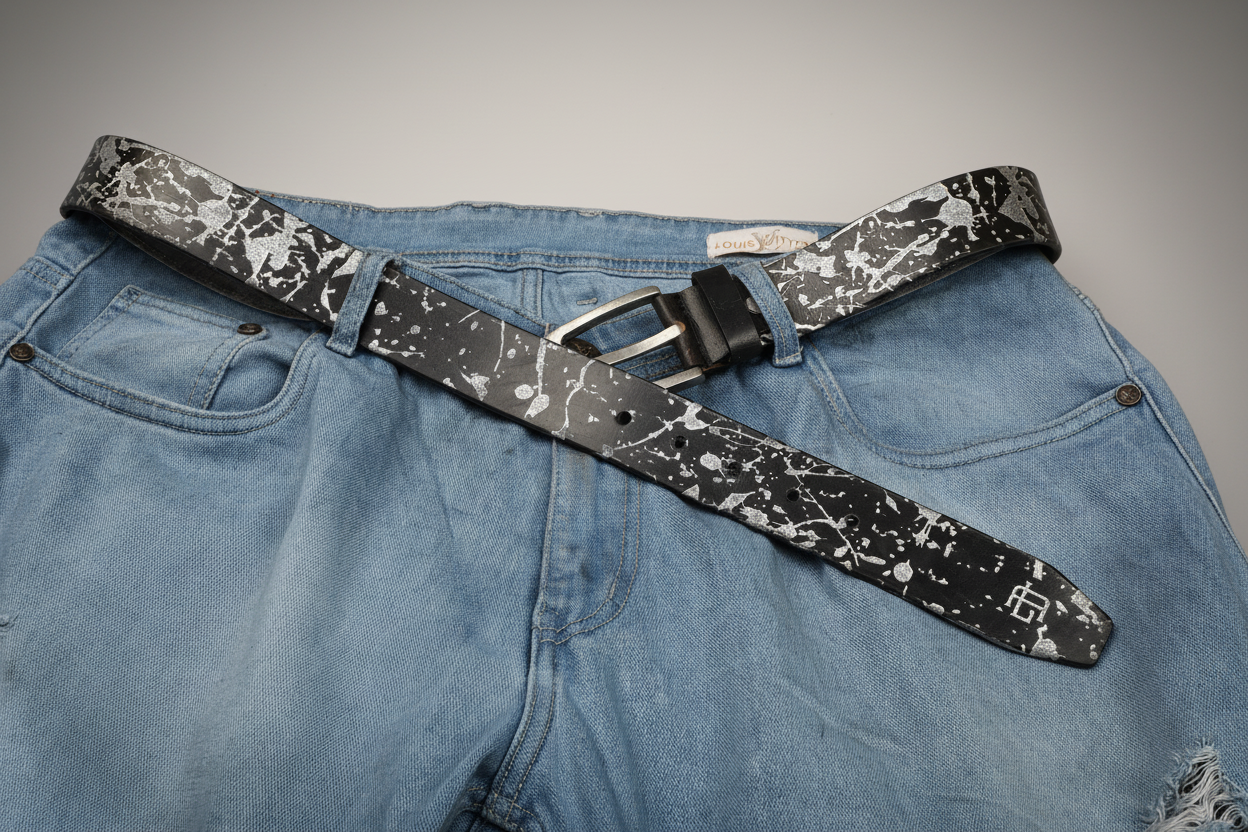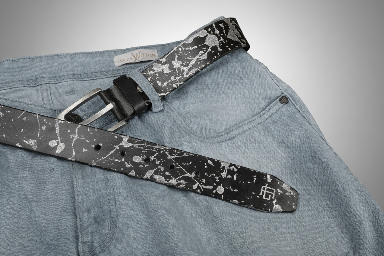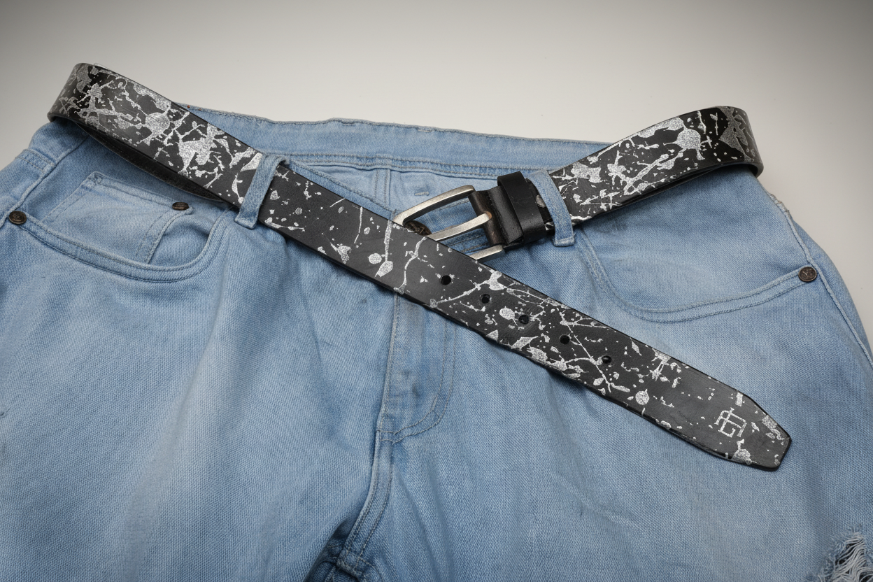 Abstract Series Pearl Metallic Leather Belt — Elevate your style with this full-grain leather belt featuring laser-etched abstract patterns and hand-painted pearl metallic accents. Durable, versatile, and uniquely artistic, it’s the perfect statement accessory for casual or polished looks.
