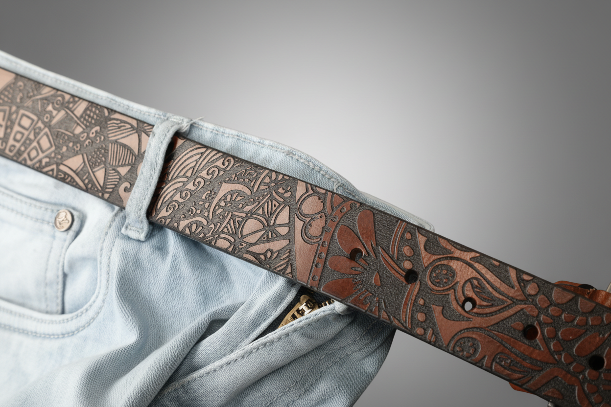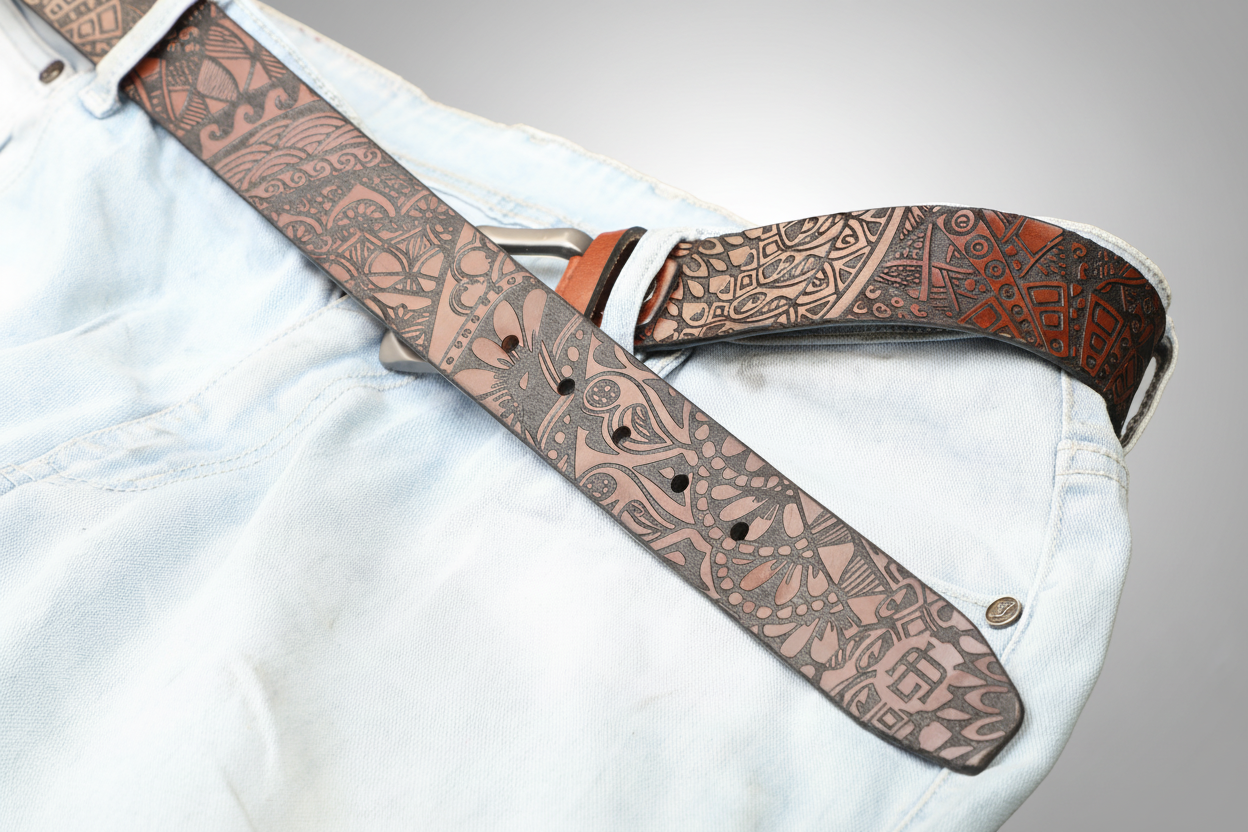 Step into a world of sacred geometry and mindful design with the Mandala Nexus Leather Belt, where timeless patterns meet modern craftsmanship. This belt features laser-engraved mandalas interwoven with Zentangle-inspired linework — each line, circle, and stroke meticulously placed to create balance, flow, and visual harmony.