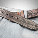 The belt features flowing, continuous knotwork that weaves human and animal forms into seamless patterns. Each motif is carefully laser-engraved, reflecting themes of connection, continuity, and heritage: