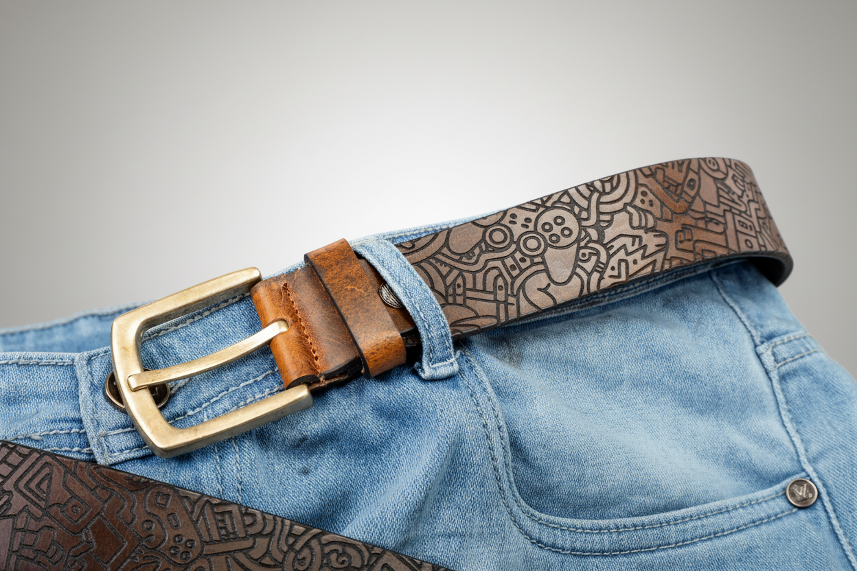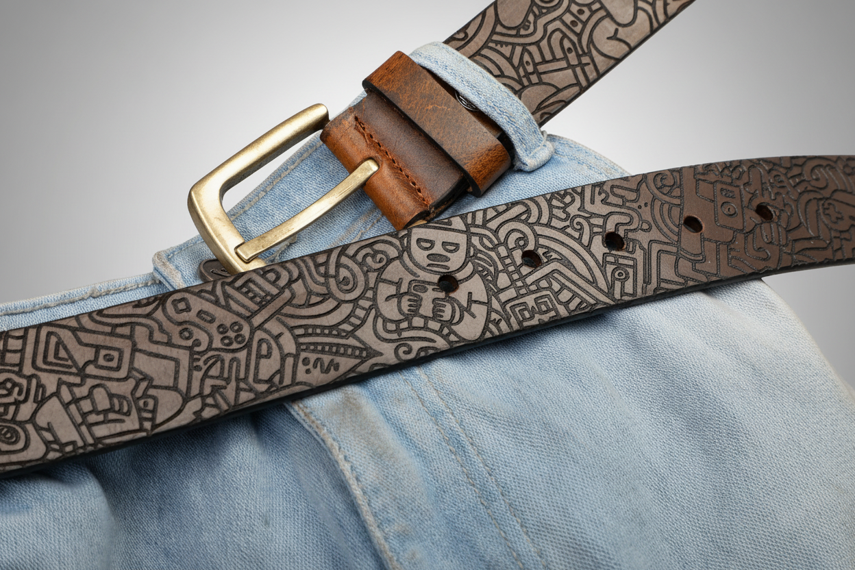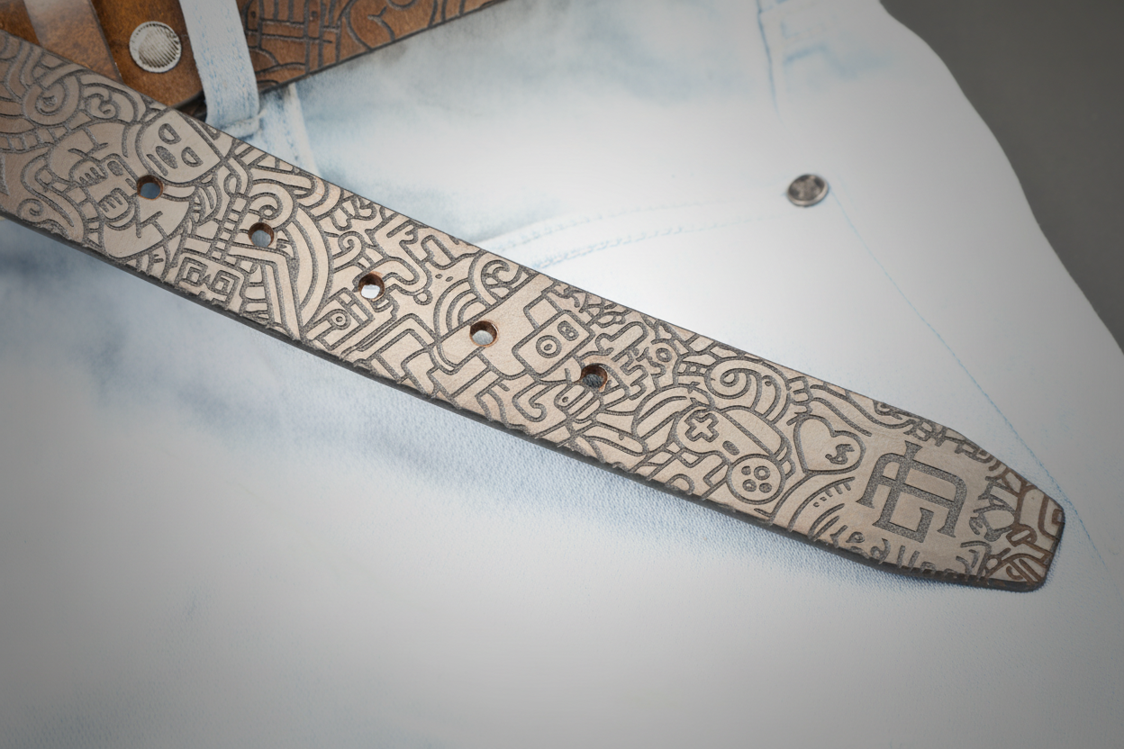 The precision laser engraving emphasizes contrast, depth, and texture, turning the belt into a tactile, visually striking statement piece that celebrates imagination and artistic detail.
