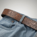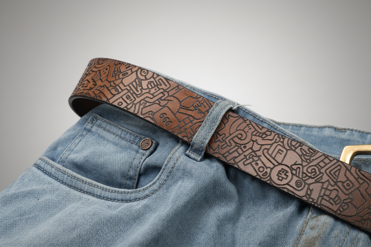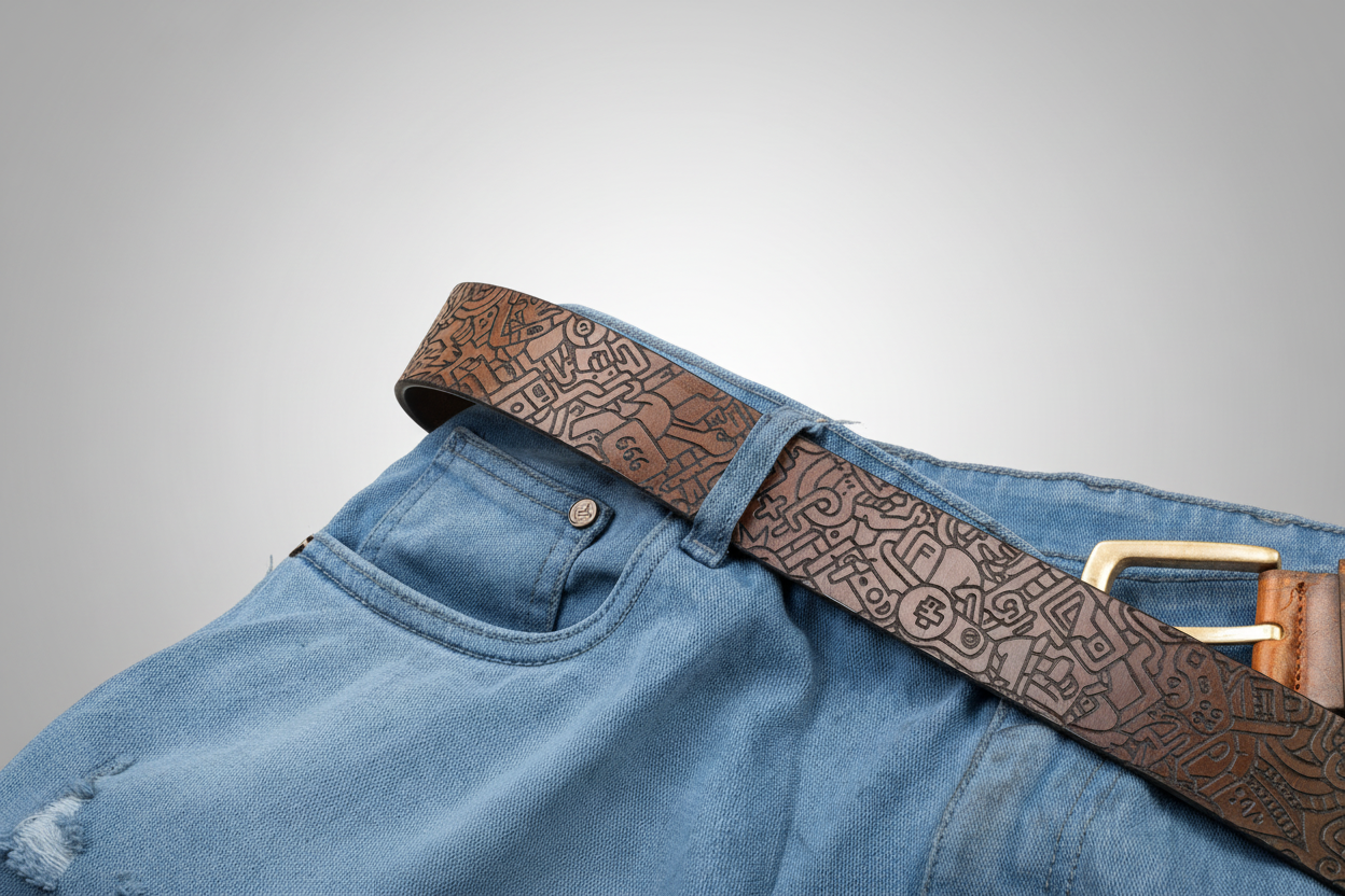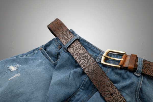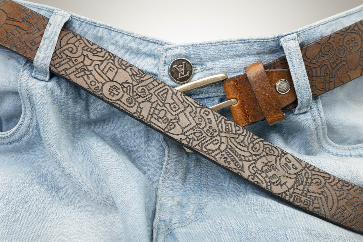 The precision laser engraving emphasizes contrast, depth, and texture, turning the belt into a tactile, visually striking statement piece that celebrates imagination and artistic detail.