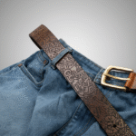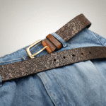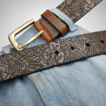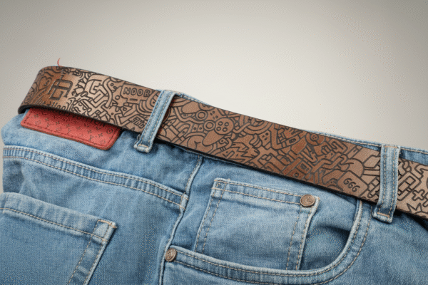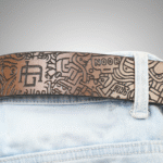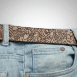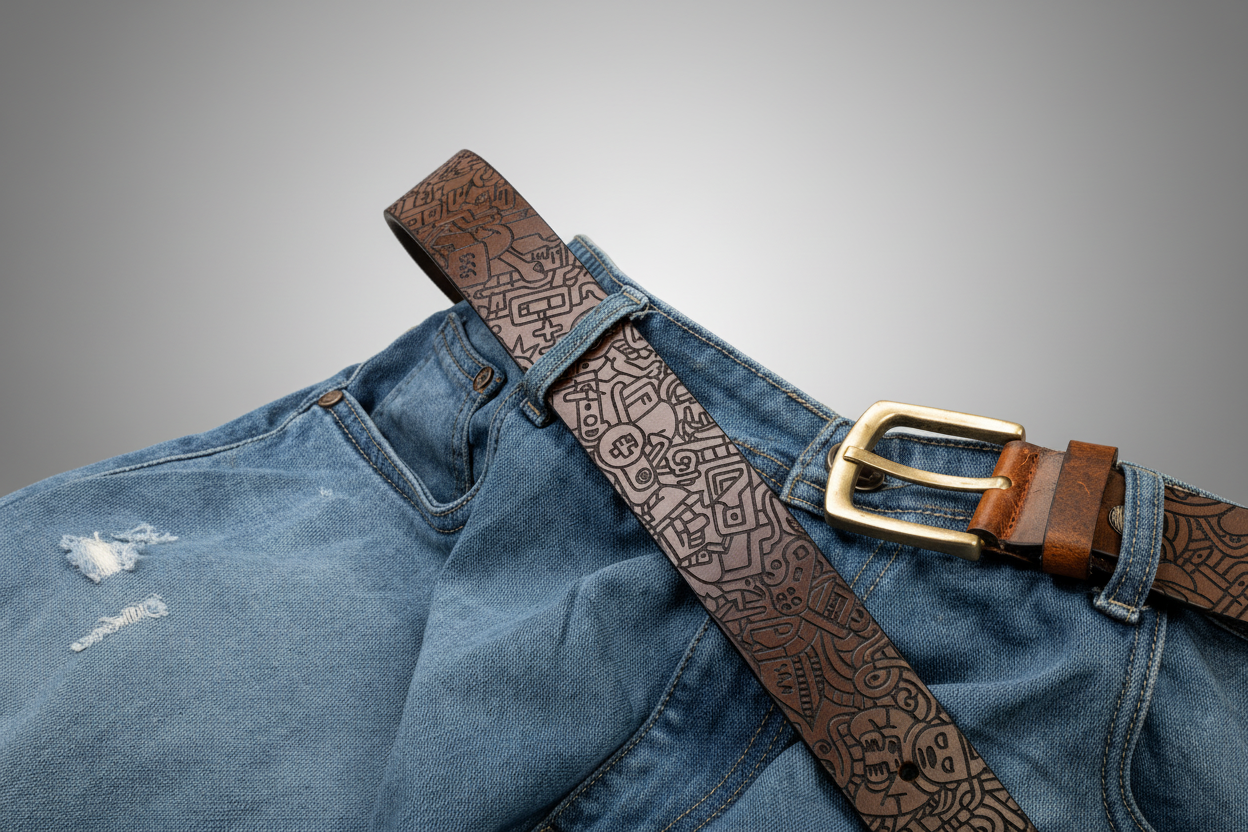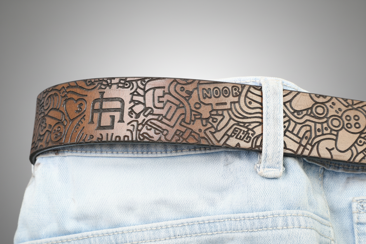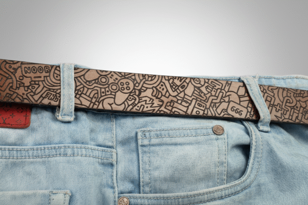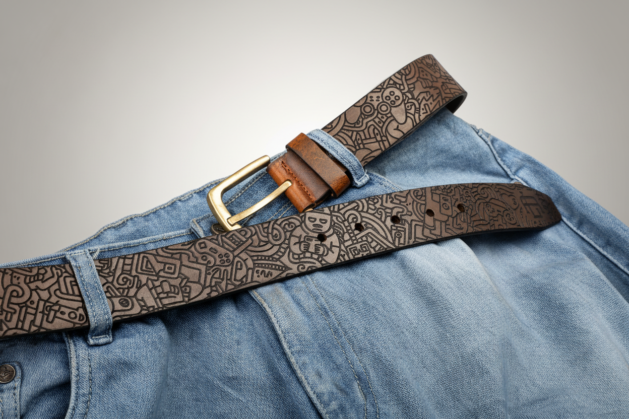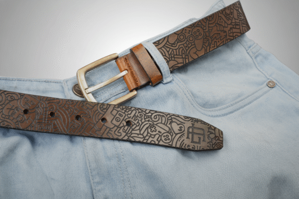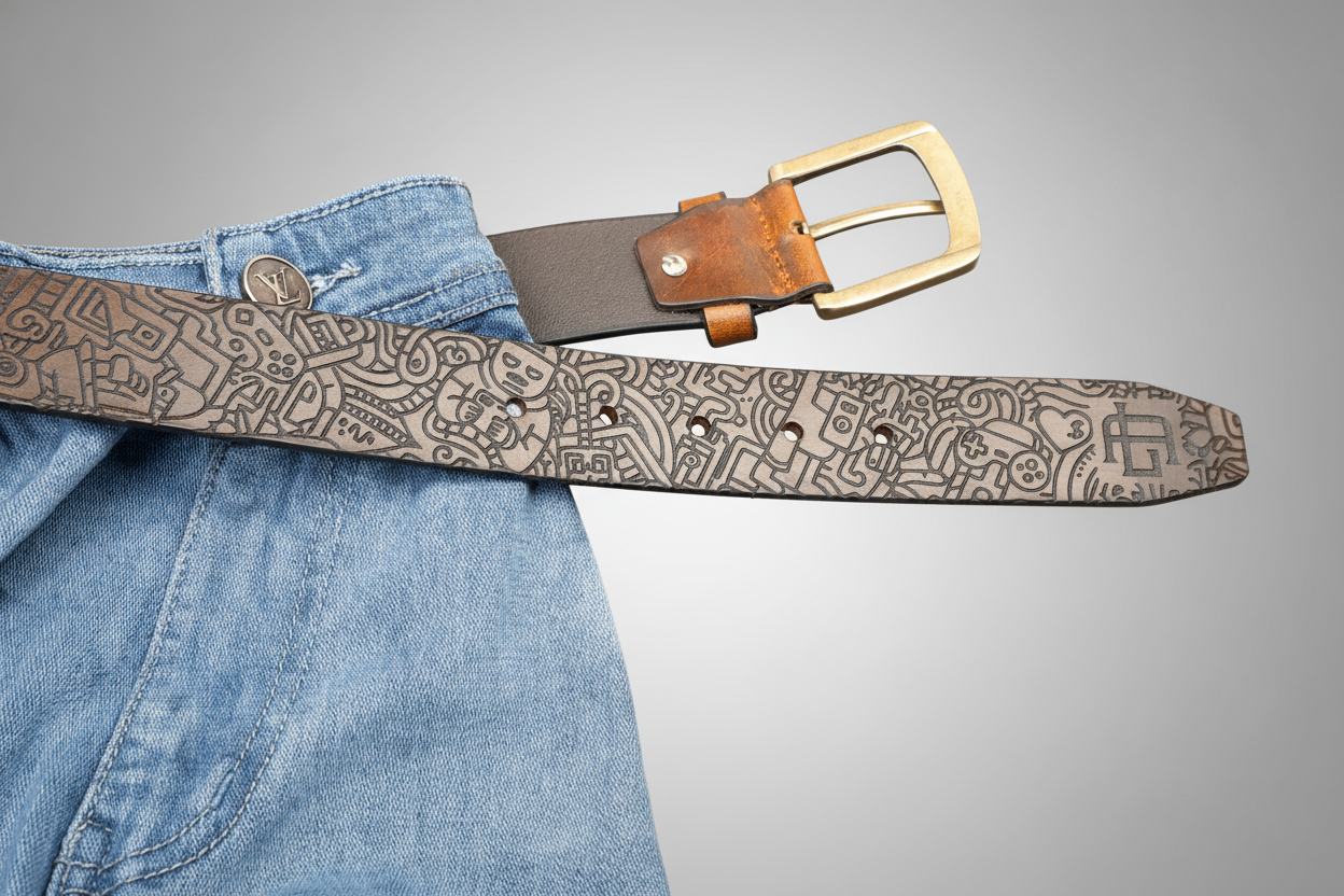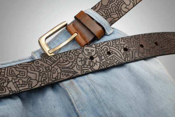Laser-engraved on full-grain leather, this belt features intricate doodle-inspired designs, from tiny figures to geometric swirls. With a rich monochrome finish and antique-style buckle, it’s a statement piece for lovers of contemporary art and detailed craftsmanship.