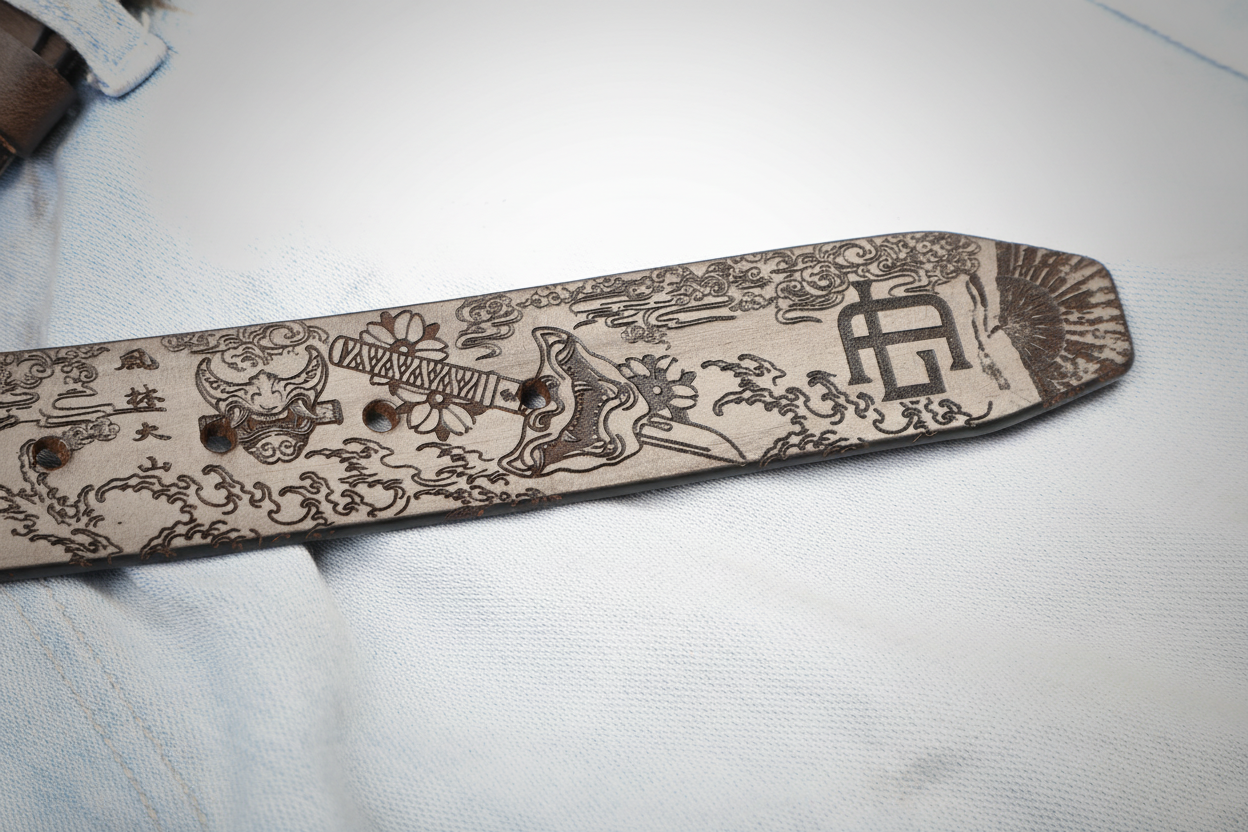 Kanji characters 鬼 (Demon) and 浪人 (Ronin) are laser-engraved into the leather, adding authenticity, cultural depth, and a bold visual accent. These inscriptions emphasize the belt’s inspiration from Japanese history and artistry.