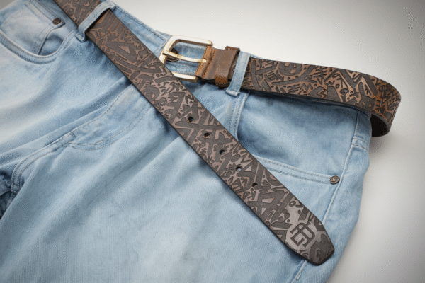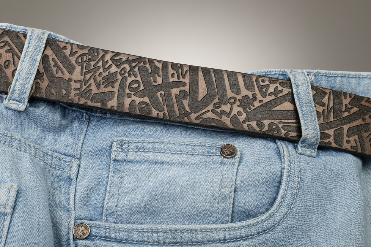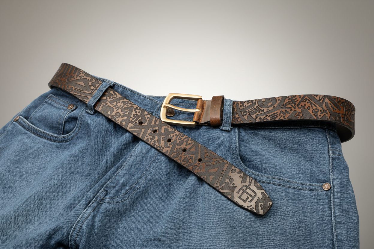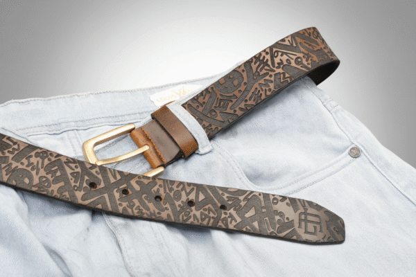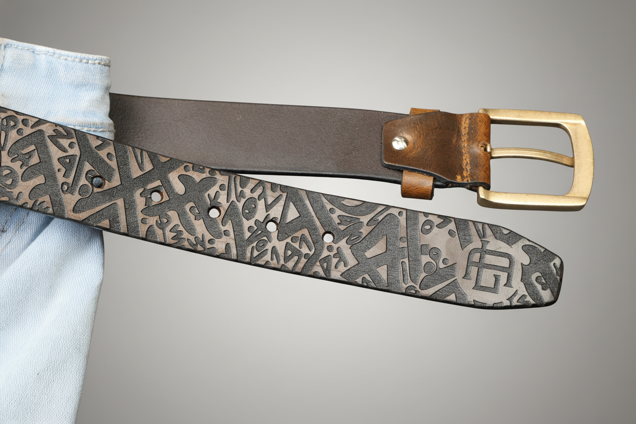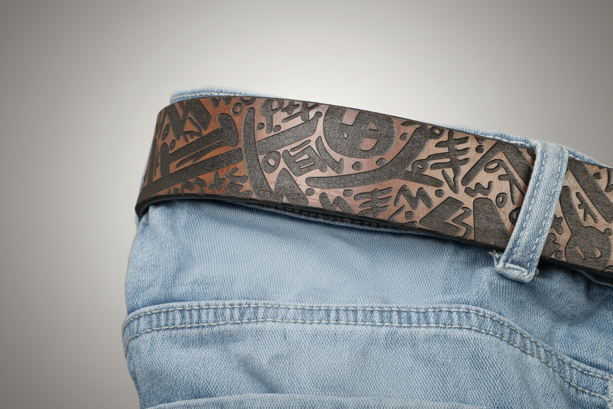 Celebrate history and design with the Phoenician Calligraphy Leather Belt — a timeless piece of wearable artistry.